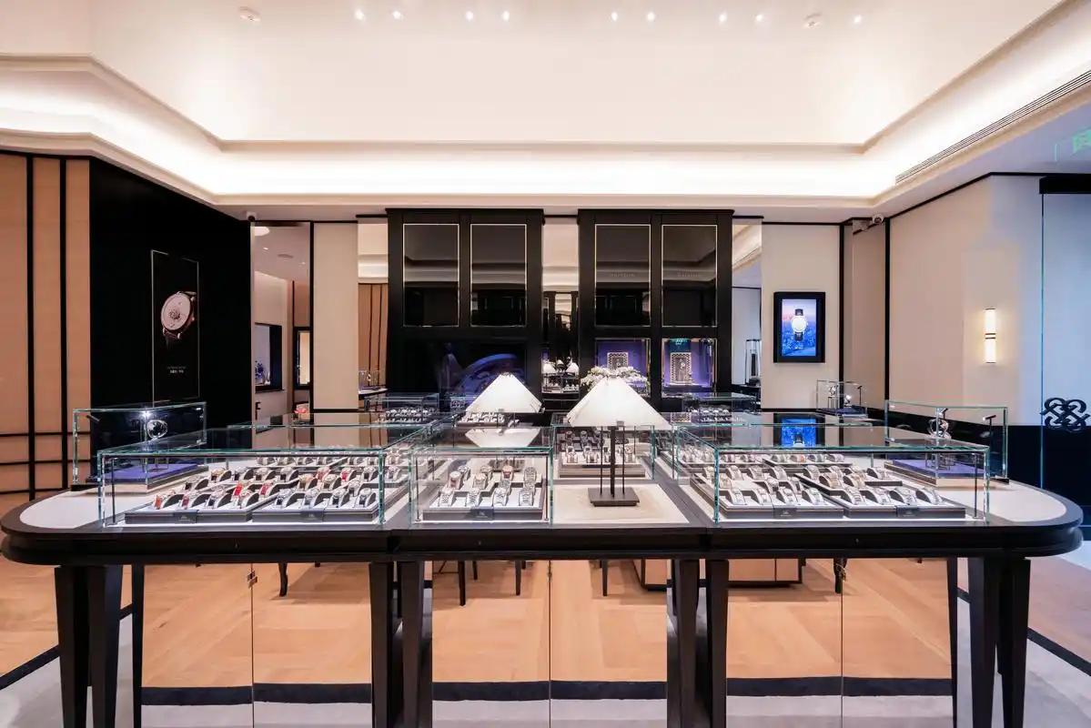 A luxury watch boutique using Huaxin Display’s wooden watch boxes: single pedestals for featured models, multi-tiered cases for collection pieces